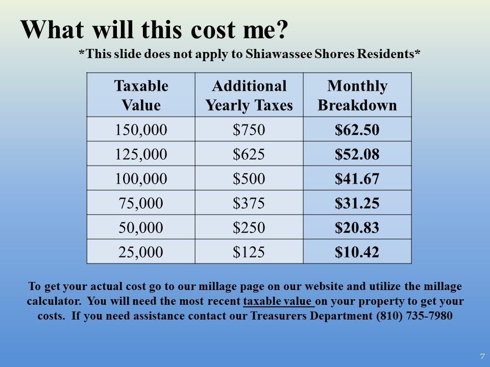 The above is an ESTIMATE of your net tax impact from the increase in millage for the above proposed bond issue. It is an estimate only and should not be relied upon as tax advice. You should consult your tax advisor to determine the exact impact on your tax computations.