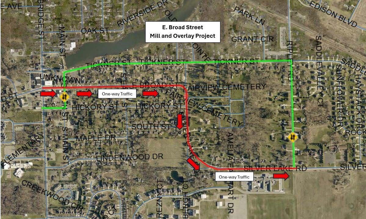 The E. Broad Street resurfacing project is scheduled to begin the week of April 20, 2026. This project will require the use of a significant detour to allow for a safe and efficient work zone for workers. Access will remain available for residents and businesses in the area throughout the project. All through traffic will be required to use the posted detour of S. Linden Road to Owen Road. The map below depicts the traffic flow for local access to homes, businesses, mail delivery and trash collection. The City of Linden will be hosting a public meeting at the Loose Center at 707 N. Bridge Street, on Monday, April 20th at 6:00 PM to discuss additional project details.